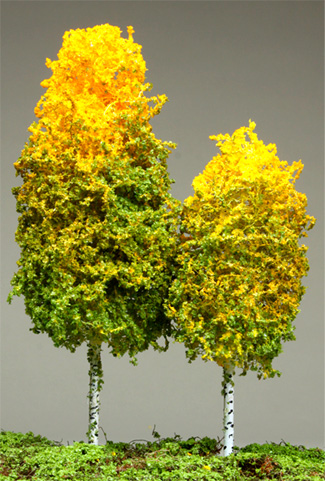 LATE SUMMER QUAKING ASPEN is one of the most well known tree species in the western USA and Canada. It is found from the northern limit of trees in northwestern Alaska through the western US and into northern Mexico. It favors conditions near streams and rivers, in meadows and in canyon rocks. Quaking Aspen is a beautiful poplar tree that makes the western theme great to model. It has creamy white bark, bright green leaves, each leaf flipping in a different direction, making the tree or grove seem to shimmer and murmur in the breeze. In late summer, aspen leaves turn yellow feathering to a green tone, and in the clear sunlit places it prefers, its colors blaze in brilliant revelry. 6" and 9" Late Summer Quaking Aspens - Handmade in the USA featuring delicate floss branches and feathing yellow to medium green 'SuperLEAF' foliage.