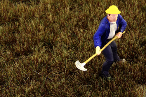 The generous sheet measures 15 x 21 cm and contains hundreds of tufts which are loosely attached to one another. This allows the modeler a variety of control. For the highest accuracy tufts may be pulled off one-by-one. As for the experienced and proto-skilled modeler, they realize that tufts grow randomly in patches or as a cluster. By pulling off several that are already semi-attached, this provides fast placement and provides a much more natural appearing growth. Shown with O-Scale figure to illustrate size only!