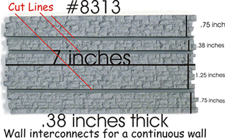 STEPPED RETAINING WALL SYSTEMS: HO or O Scale medium cut stone dressed row walls contain four walls measuring approximately 7" wide. Made of cast resin.