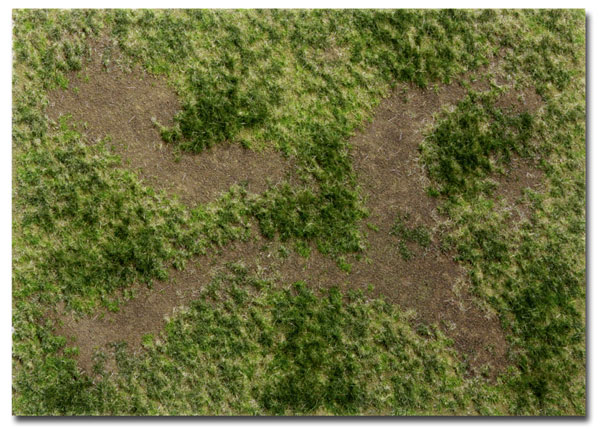 This mat consists of shorter 1-2mm tall a 4mm tall grasses. Ideal for smaller scales and for most seasons. The mat represents un-maintained growth with years of grass regeneration. Within each cluster of grass is a sparse base layer of 1-2mm dry grasses dead and dry from previous seasons. Sprouting from the same area are 4mm tufts of new healthier grasses in two tones in random fashion. The grass clusters are randomly placed by hand and gently feathered into fine unhealthy soil.