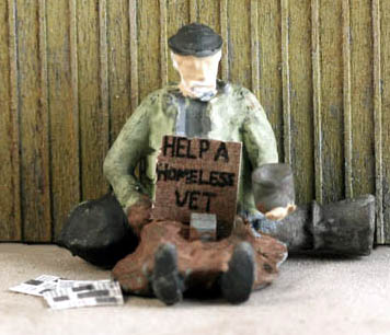 HOMELESS BUM WITH COIN CAN - O-Scale 'street life' as a homeless man. Sitting man measures approximately 1 inch. This old man has had better days... from our "Street Life" custom Figure Series. Detail your Sidewalks or train platforms with this Beggar. Includes his cardboard sign, newspapers, coin can, blankets and Rucksack. O Scale Figure comes Finished