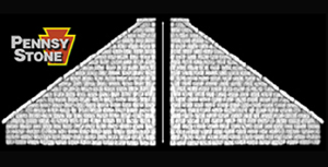 'PENNSY' O-SCALE RETAINING WING SET - Designed for use as recessed tunnel wings or wall ends. Blends with ALL 'Pennsy' stone block wall components. Sold in pairs. Outside dimensions: 9" W x 7" H x 1/2" thick. 'PENNSY' O-SCALE SYSTEM is a fully integrated system featuring the classic dressed block pattern of the Pennsylvania RR. Each component matches with each other to create a limitless combination of masonry construction. VIRTUALLY EFFORTLESS! FL6150-Cut 'Pennsy' Stone Block Wall, FL6161-Single Track Cut Block Portal, FL6262-Double Track Cut Block Portal, FL6263-Extra-Wide Double Cut Block Portal, FL6191-Stone Retaining Wing Set, FL6158-Stone Seam Sealers Set of 3.