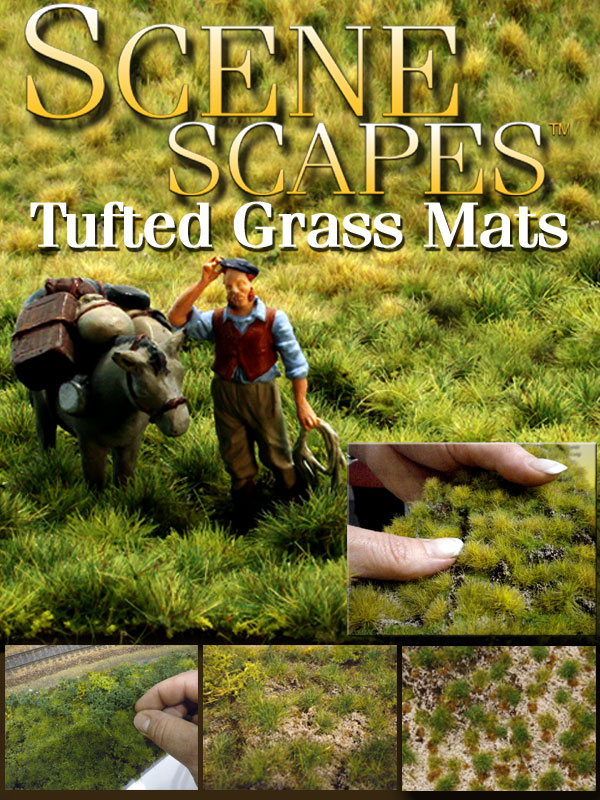 Medium Green TUFTED Mat begins with an electrostatic marsh-tone static grass base sheet to which a second layer of dark brown base ground fibers are incorporated among short and long, dark and light green grass reed tufts and medium-green foam textures to achieve the realistic appearance of a healthy peat bog swamp or marsh.